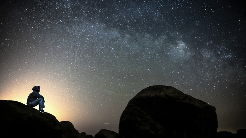 Ein Mensch sitzt auf einem Feslen, schaut in die Sterne und denkt nach