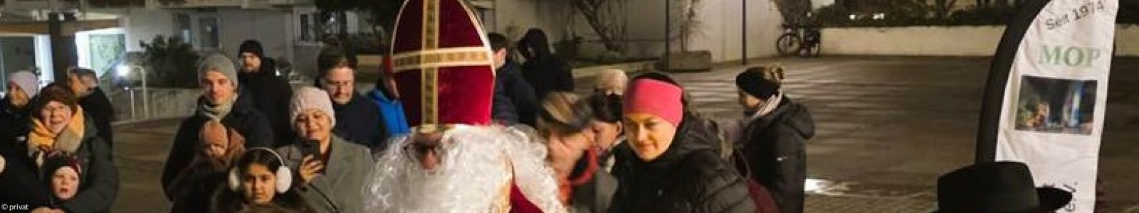 viele Leute umringen einen NikolausNikolaus und ein kleiner JungeEin Mann in altertümlichem BischofsgewandNiklaus gibt einem kleinen Mädchen die HandNikolaus in einer Menge von Leuten